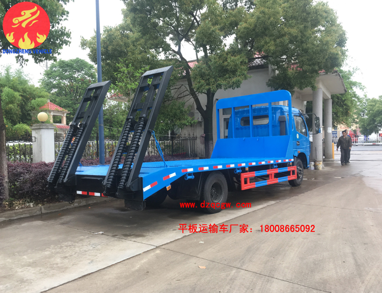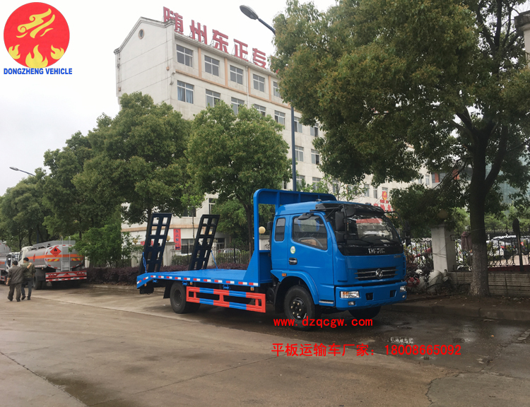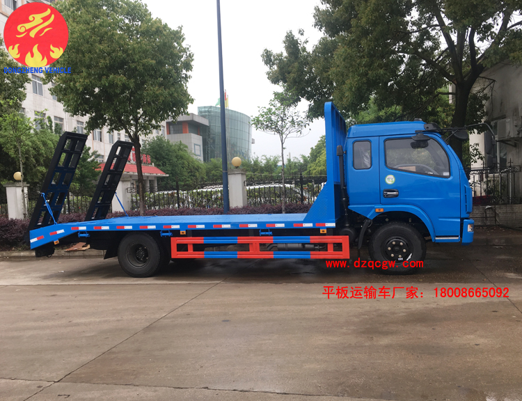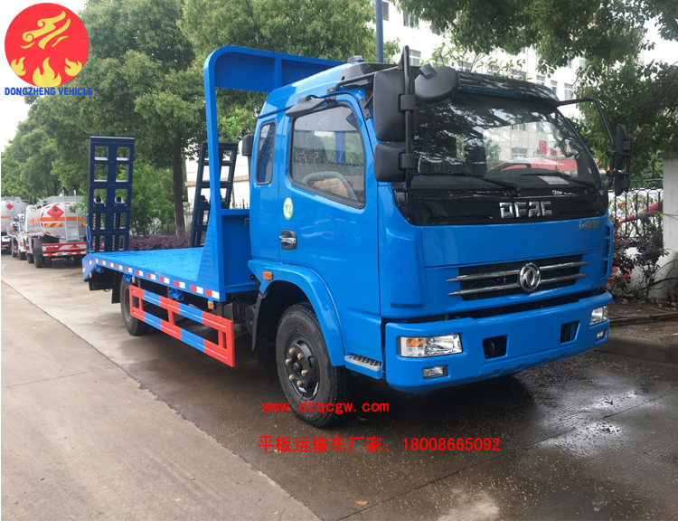 該平板運(yùn)輸車采用東風(fēng)多利卡排半駕駛室,4400mm軸距,玉柴150馬力或朝柴156馬力柴油國五發(fā)動(dòng)機(jī),帶燃油和環(huán)保,8.25的鋼絲胎,ABS。板的尺寸5.5米X2.3米,斜坡長60mm,后雙彈簧,帶爬梯,龍門架上帶工具箱。