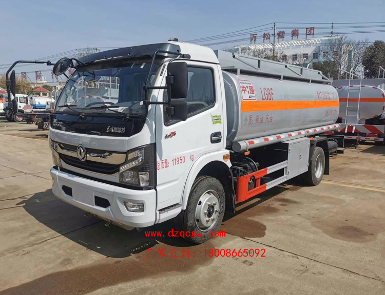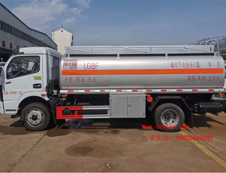 罐體容積10.3m3,罐體采用4.2mmQ235B鋼板制作,壹個鋁合金歐式罐口,專用油泵,可自吸自排,泵的出口在右邊,一個鋁合金海底閥(加裝聲光報警),正星大流量加油機及15米卷盤,加油機下掛至正駕一側(cè)。一套油氣回收裝置,一套防溢漏報警裝置,一個下裝口,一個靜電線盤,罐頂升降護欄。一個工具箱,一個防火帽,帶堵蓋,炮筒,配4KG滅火器。罐體先噴底漆再裝車,所有管道裝車時刷防銹漆,罐體金屬銀灰漆,貼反光線條及3號危險品標(biāo)。
