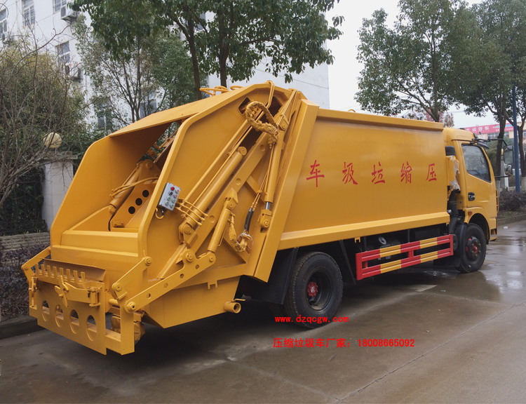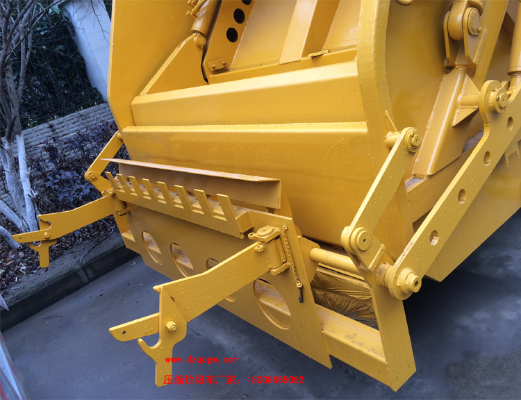 廂體材料為武鋼優(yōu)質(zhì)炭鋼,厚度為邊5mm,廂體容積為7-8立方米。由裝料機(jī)構(gòu)、壓縮機(jī)構(gòu)、卸料機(jī)構(gòu)、油泵、油箱、控制閥等組成的液壓機(jī)構(gòu)組成。裝料機(jī)構(gòu)由支架、連桿機(jī)構(gòu)、凸輪、掛鉤等組成,在油缸作用下,將垃圾桶內(nèi)的垃圾自動翻轉(zhuǎn)倒入料斗內(nèi)。新款有9支液壓缸制動,不帶副壓板,液壓控制操作系統(tǒng)為電動控制和手動控制。